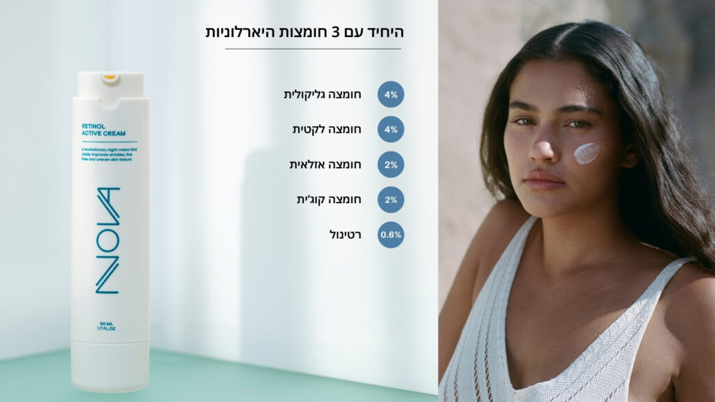 בין אם את מתמודדת עם פיגמנטציה בעור, קמטים או קמטוטים – החומרים הפעילים (7) בקרם הרטינול האקטיבי של נובה יעזרו לך להשיג עור פנים חלק, נעים כמשי ובריא.