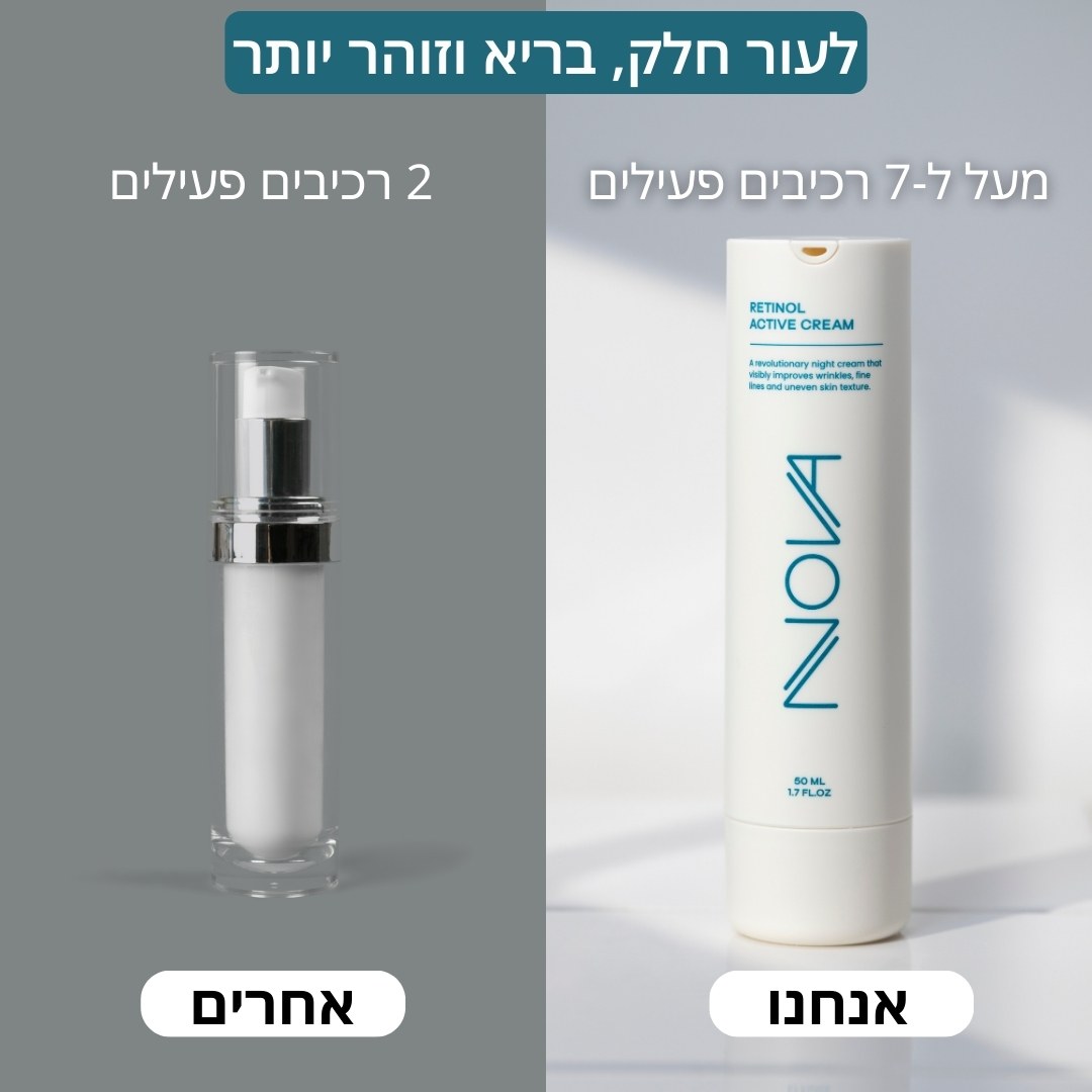 חברות קוסמטיקה אחרות לא רוצות שתדעי: שלא כל קרם רטינול, הוא קרם רטינול אמיתי. מרבית תכשירי הרטינול בשוק מבוססים על רטינאל – נגזרת חלשה יותר של ויטמין A – לעומת קרם הרטינול של נובה המתבסס על רטינול עוצמתי ואיכותי; מה שהופך אותו לחזק בכ-20% יותר מקרמים אחרים. המשמעות עבורך? עור פנים חלק, אחיד וזוהר, בזמן קצר יותר (30 ימים לתוצאה חיובית ראשונית).