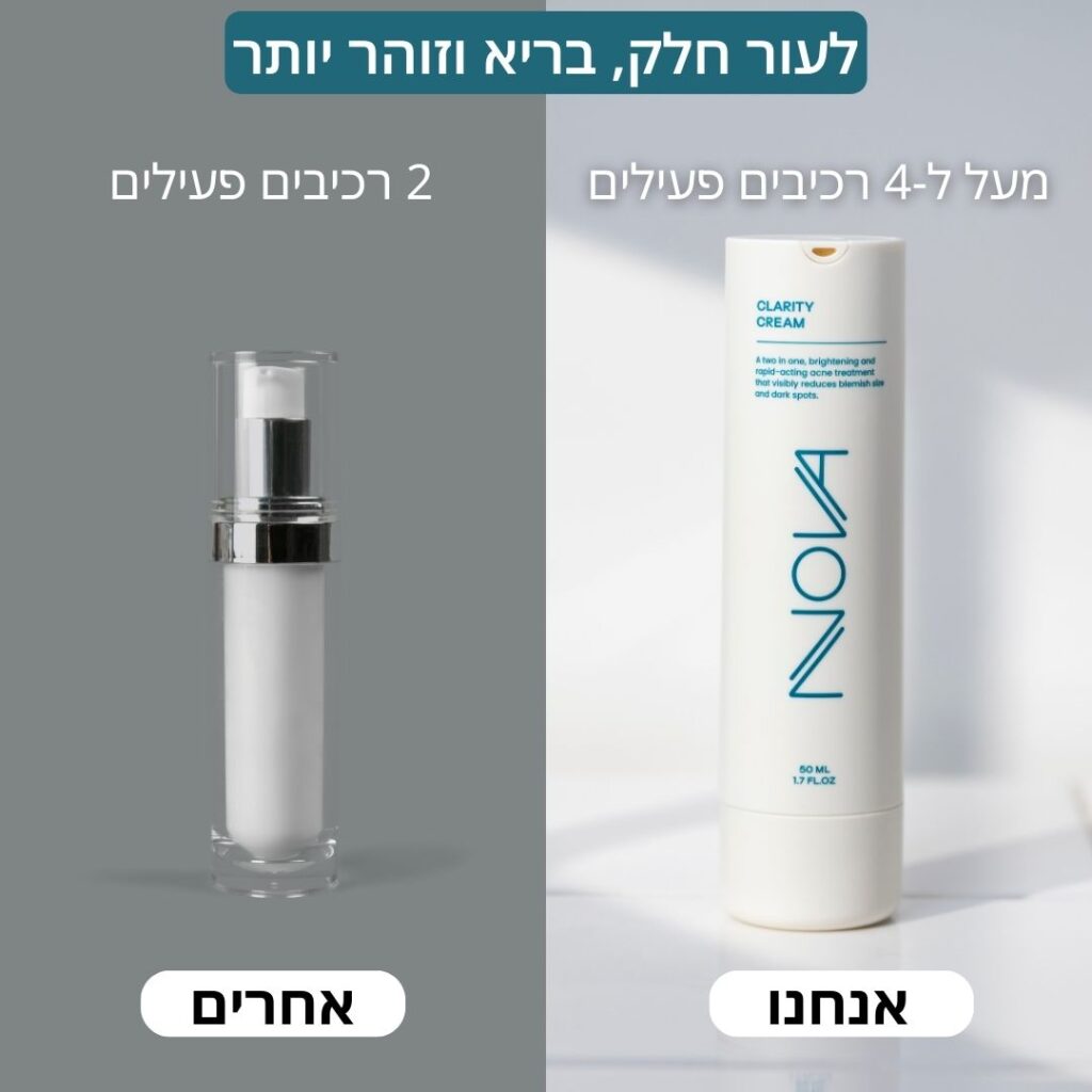 חשוב שתדעי, ואולי חווית זו בעצמך, שתכשירי אקנה רבים מסבים לעור יותר נזק מתועלת; בעיקר בגלל חומרים כימיים שנועדו לייבש את הפצעונים אבל פוגעים בשכבת ההגנה הטבעית של העור, בחומציות שלו ולגרום לתגובה הפוכה. קרם קלריטי של נובה מטפל בצורה עדינה אך מאוד יעילה בעור, פורמולה המבוססת חומרים טבעיים בלבד, ונטולת SLS וחומרים מזיקים אחרים.